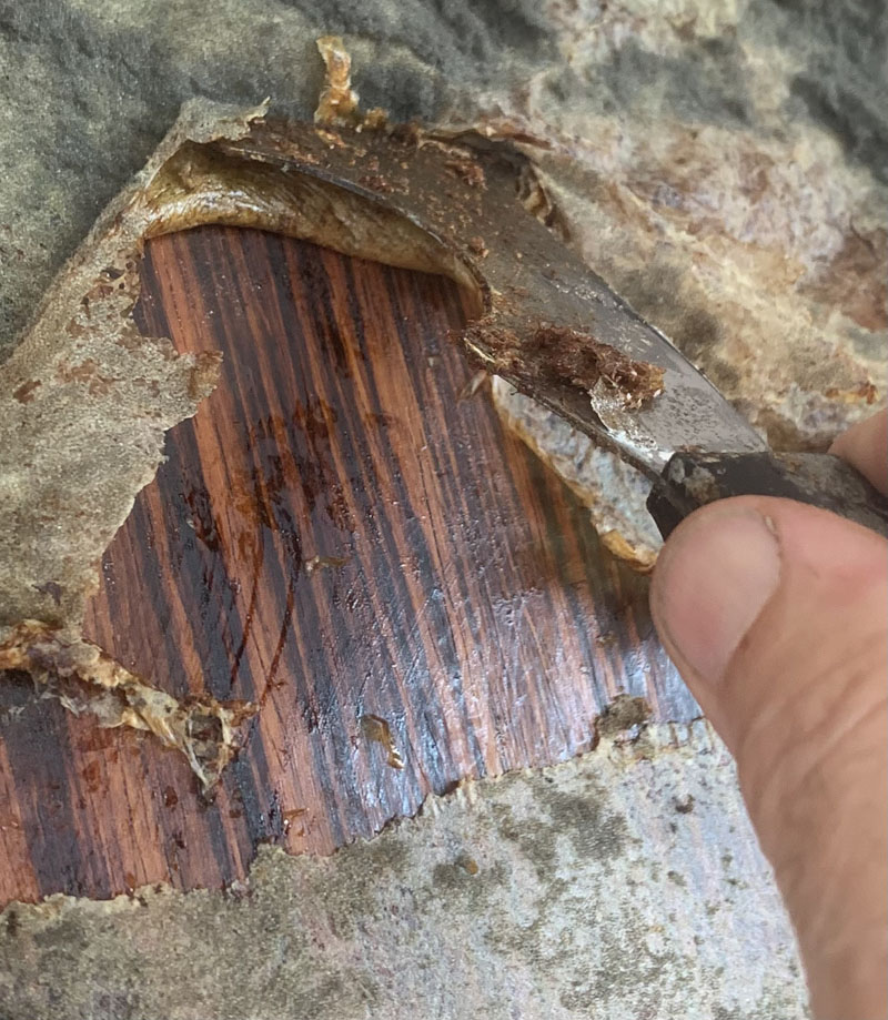 Stripping glue, foam and awful grey fabric off of the main salon walls, which are paneled in rare Brazilian Rosewood. Hard to believe the previous owner did that…