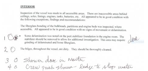 In case it's too small to read, item 1 is: "Some delamination was noted on the port stabilizer foundation in the engine room. The stabilizer should be removed to allow for additional investigation. This area may require grinding of delaminated and loose fiberglass."