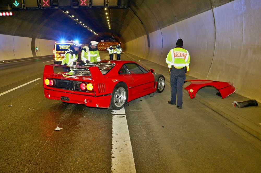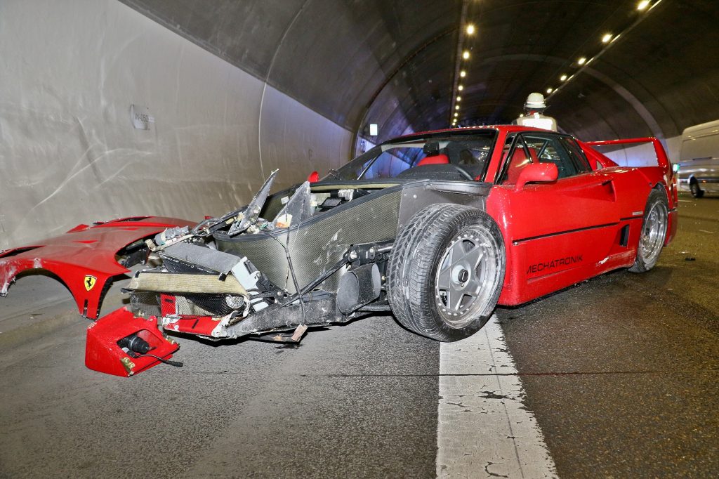 That hurts!!! A 23 year old employee of a luxury car dealer crashed a 1990, 3 Million Euro Ferrary F 40 with 21.000 km on the counter during a delivery tour to an exhibition. The crash happened in a street tunnel in southern Germany. The Ferrari came into a skid and touched both tunnel walls. The driver was transferred to a hospital and the Ferrari most probably too. I can imagine, the owner of this car had some tears in his eyes .