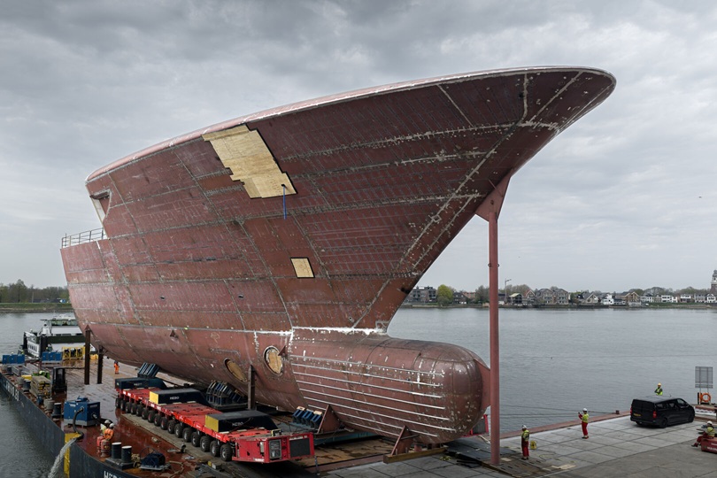 A new bow has been seen out in the open and it is for a secret build by Feadship that is supposed to measure above 140-meters. The delivery time from now should be around 2029. The bow section is large measuring an approximate 30-meters alone. Image by Ruben Griffioen.