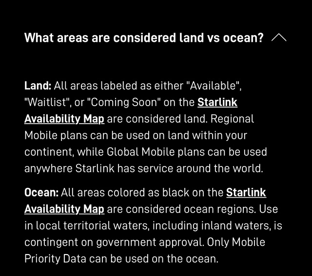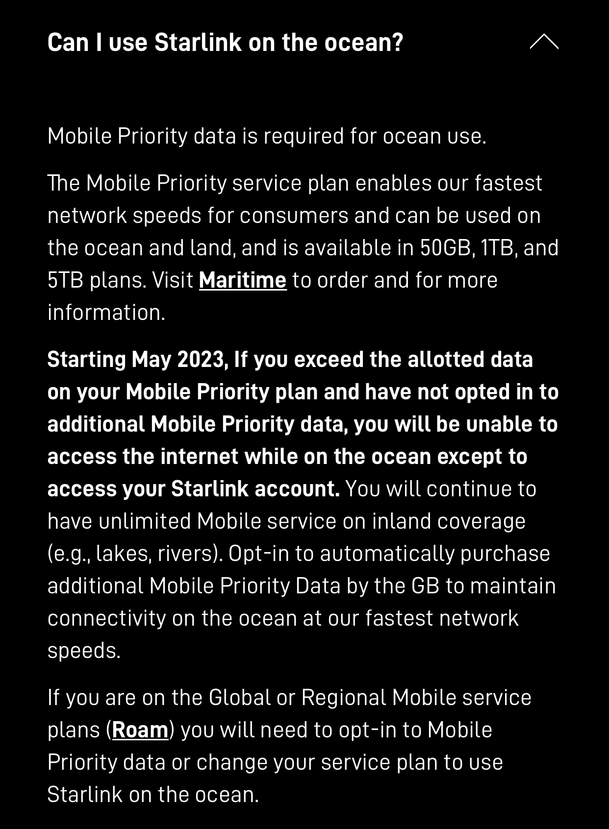 Yea I guess some lawyer at starlink spotted a word he didn’t like …. I guess the part where it said “coming soon” was “ocean” since it encourages people Tobias SL where it’s not legal yet. the slow speed cut out varies from user to user. In our case even going 6 kts out the marina channel and just touring around under 10kts was enough to shut down. That’s why I switched the the HP in motion dish. I m sure that’s going to be enforced since they offer the HP dish