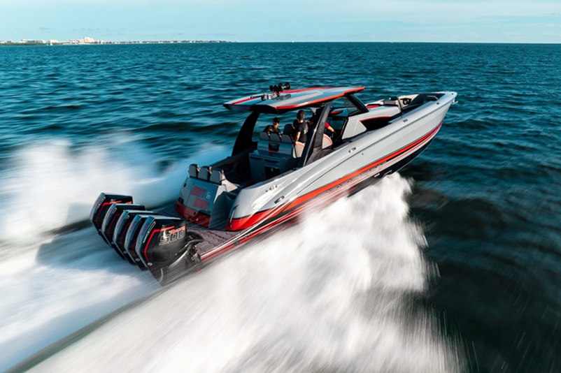 5. Concept had an eye-catching blue specimen from their reimagined 44 Open Deck series of super console at the show. It blends open deck space with the comfort of the center console behind the single-piece plexiglass windshield. On the transom it had four Mercury 500R outboards for a total of 2,000 horse power. The builder suggest that the maximum installed power for this boat is 2,500 horse power. The vessels length is 44.4-feet with a beam of 10.9-feet. The redesigned model includes new deck steps for easier access, a redesigned leaning post with a sink and bait prep station, and a forward speaker pod with four 8.8-inch speakers to help lift your sand-bar presence and experience.