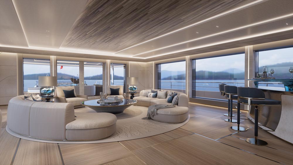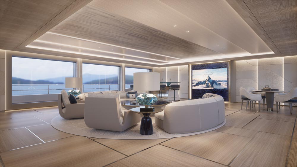 7. Abeking & Rasmussen ARUBY project is a partnership with Reymond Langton. While you will find 'structure' and formality to the interiors onboard with defining leading lines in the various spaces, this is all broken-up via the use of curvature in the furniture, and finished dressings of the space. Mid-tones with an overall light palette is the safe way to present when designing for a broad spectrum and the ARUBY interiors achieve this. The interior volume has been estimated at around 1,770 GT. Below is an example of the main saloon space.