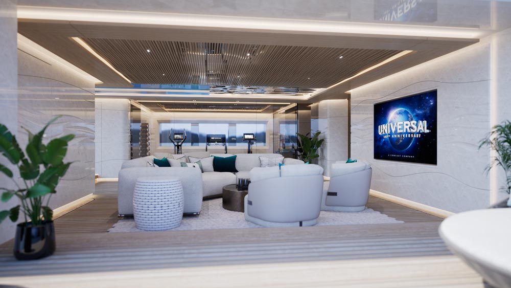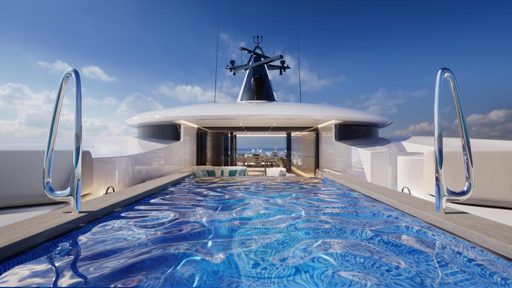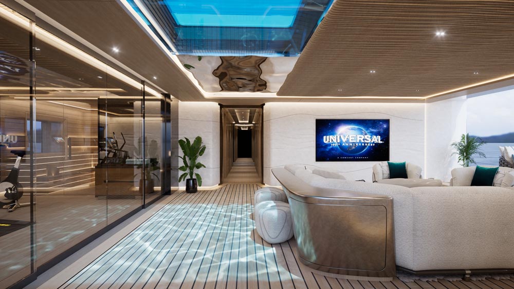 9. The main pool on the ARUBY project is situated directly above the yacht's Beach Club facility. Gone were the days where this space would have certainly been utilized as tender and toy storage. Even the smaller 40 to 45-meter yachts have dedicated Beach Clubs. On ARUBY, the space is large and usable and has a few features in store for guests who descend to this level of the yacht. There is a large flat-screen television for entertainment, many comfortable sofas which are oriented in such a way that guests can enjoy the views outside through the shell door when it is opened and folded down to the water. On the opposite side is the wellness area with facilities like the gym. Looking above guests will be greeted with a skylight. That is filtering the natural light through the water in the main pool above.