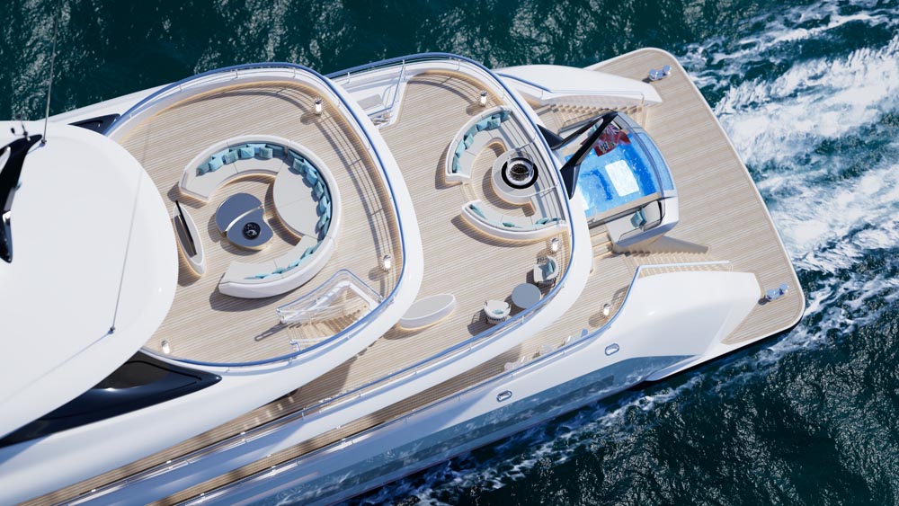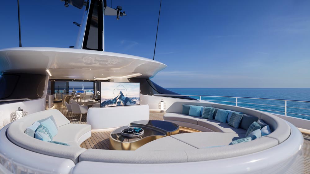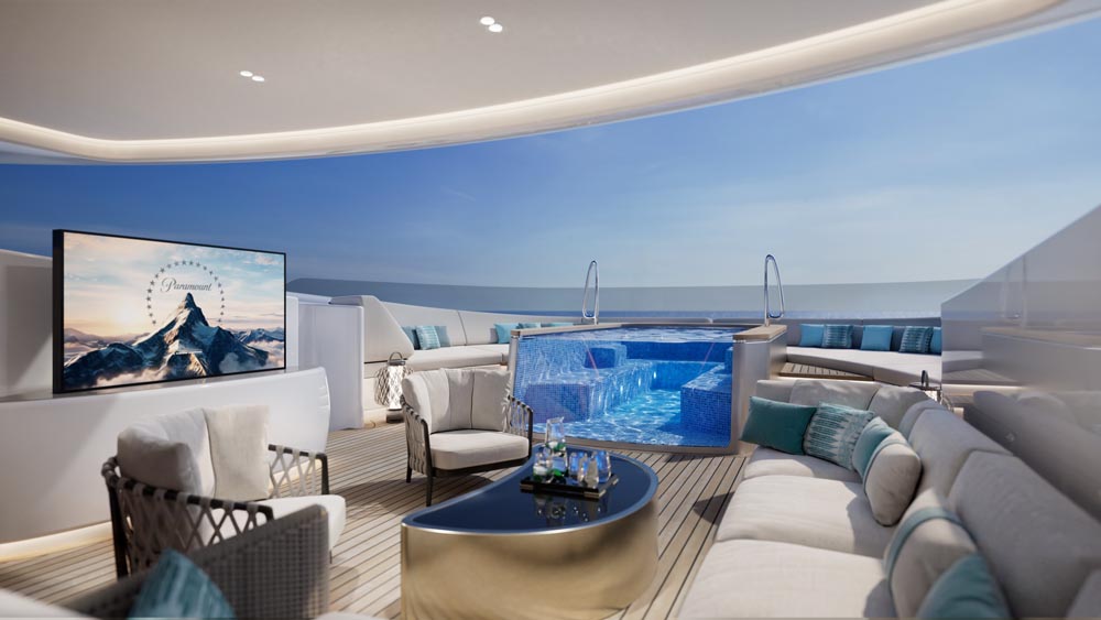5. Below showcases the forward portion of the sun deck where you can see the large jacuzzi taking up residence along the centerline at the fore of the deck. It is surrounded by sunpads offering premium vistas surrounding the majority of the yacht. Towards the midships area of the deck, guests come under the large hardtop which provides respite from the direct sun but also provides a cozier locale to relax further. Envisioned is a large outdoor flat-panel television that reveals itself from its own cabinet. Bare in mind, there will be room for personal customization of many of the areas onboard.
