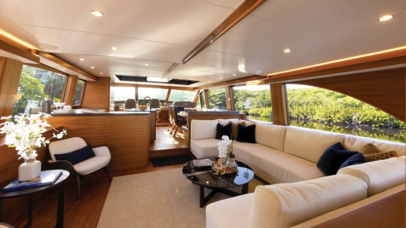 4. In terms of performance the PB85 top speed is 26-knots while the fast-cruising speed is 23-knots. However, dial back the throttle to 21-knots and the range is estimated to be 700 nautical miles. At that speed the yacht consumes 58 gallons per hour. A pair of Volvo IPS 1350S @ 1,000 horse power is the standard power aboard the PB85. Up to 10,000 LT of fuel can be carried in her tanks. Additional specifications include a length of 27.55-meters with a beam of 6.76-meters.