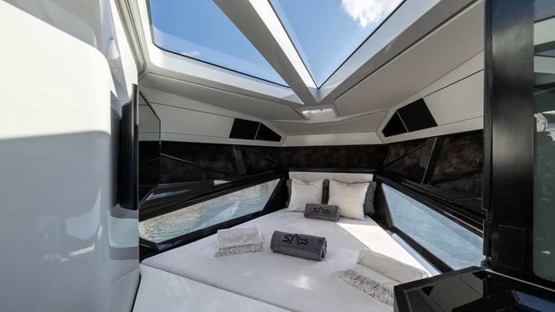 4. The glass-like covering on the foredeck not only cleverly incorporates a 'Y' in the design but it serves practical purpose of naturally lighting the forward lower deck. That area below comprises of the V-berth, dinette, Head area, general storage and drinks/wine cooler storage. The SAY 52 can comfortably take guests on weekend jaunts with ease. The €2,000,000 vessel is a very light boat for its size reportedly weighing 7.5-tonnes using half as much fuel as its competition. With 1,200 LT of fuel the vessel can easily handle weekend getaways within 300 nautical miles. Top speed is around the 45-knot mark.