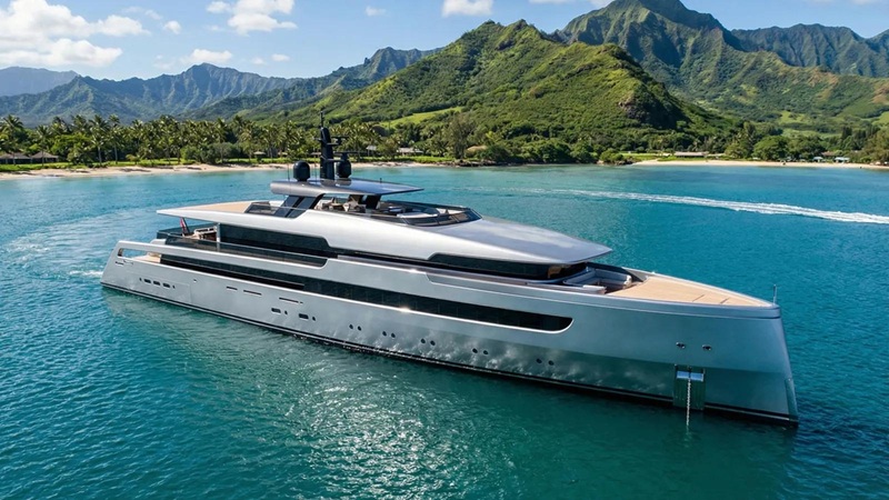 "Ion" proposed by UK Studio ThirtyC. 55-meters (180-feet) Proposed design incorporates nuclear power plant, arguably, one smallest for vessel this size. To mitigate complex power management the reactor doesn't couple directly to power the transmission/drive train. Instead charges supercapacitors or batteries (depending which emerging technology) and runs electric podded propulsion.