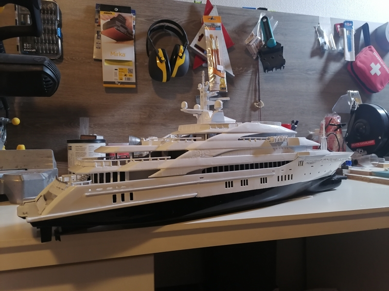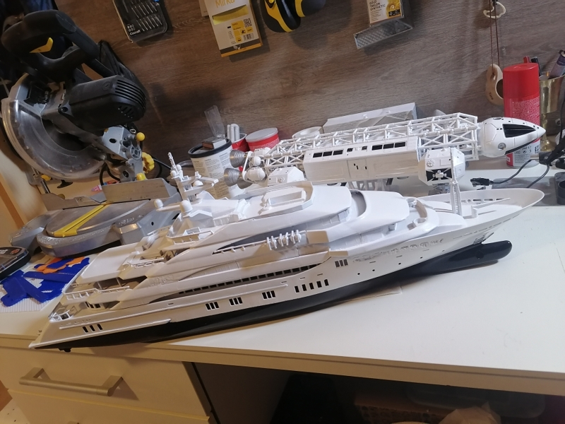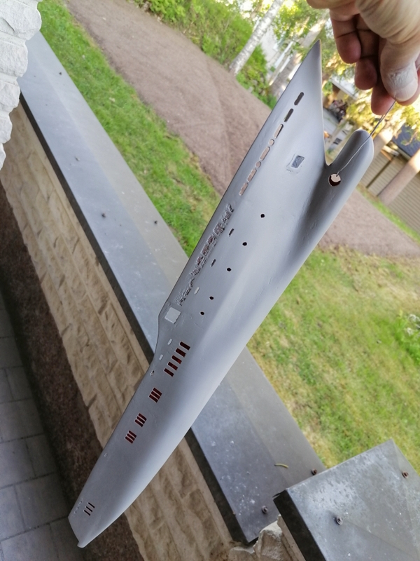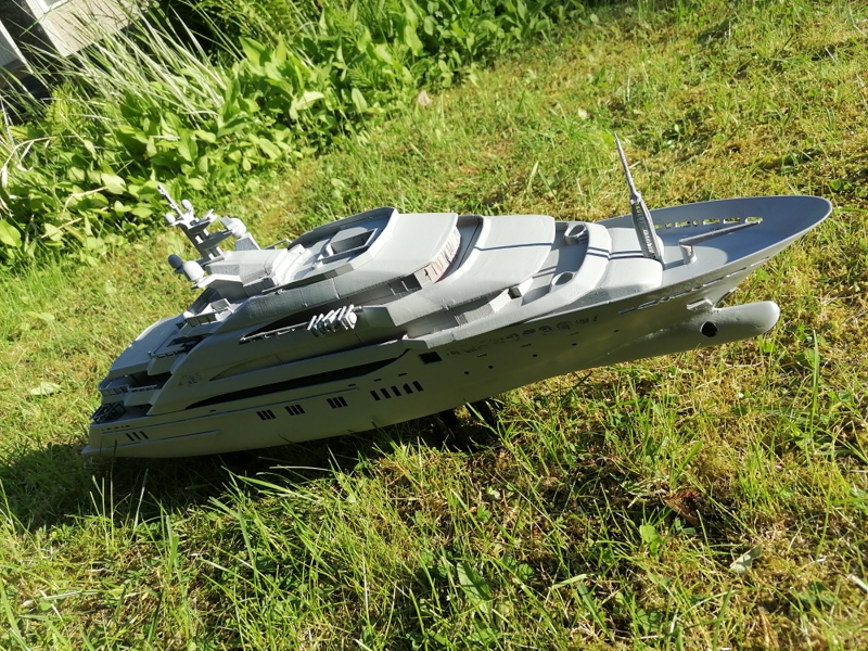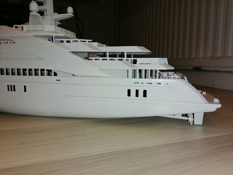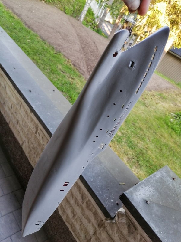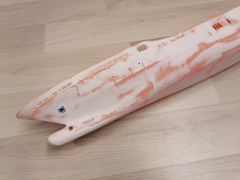 Primed. Needs some more sanding. Made some primer droplets. Next white gloss paint on top and black gloss on hull.