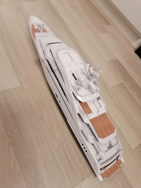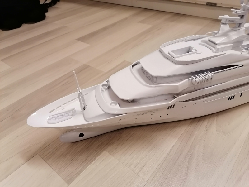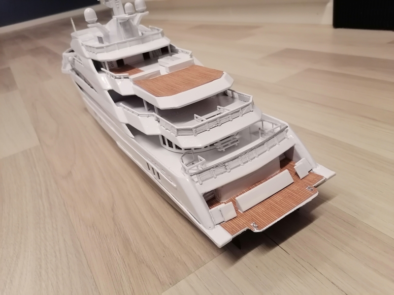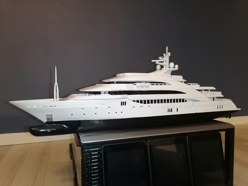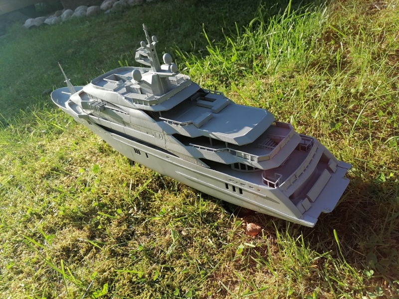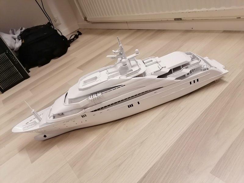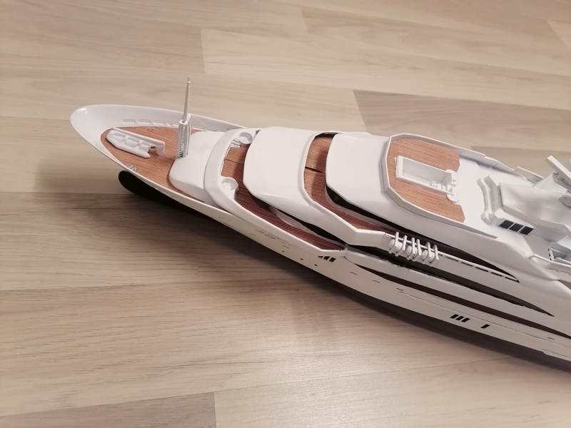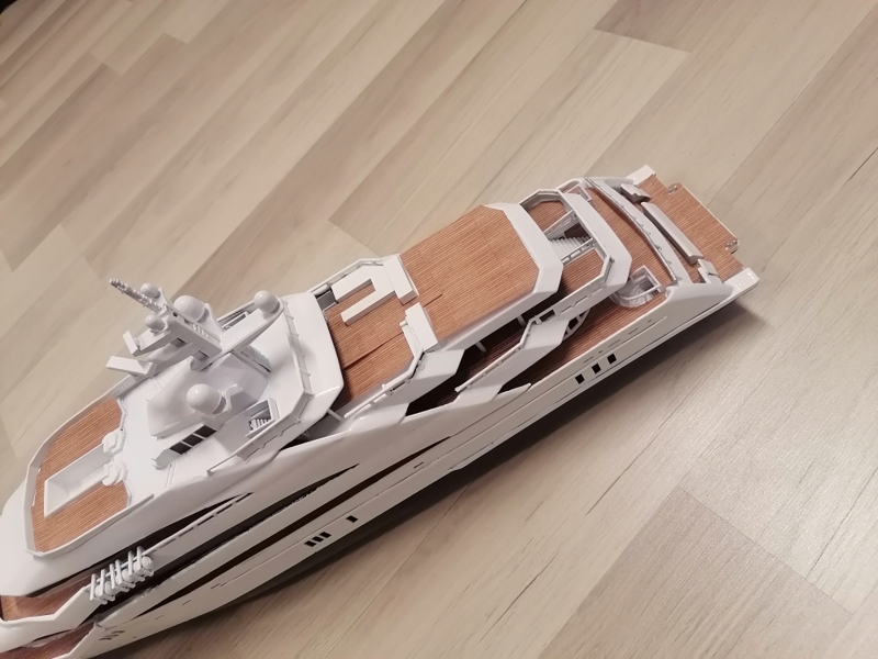 Final, Mega Yacht. One line Windows painted others have glued black glossy plastic. Still my painting skills are horrible. Hands shaking and eyes in bad condition. Learned so much with this project. If I do it once again this time to 1:100 scale it will be 80cm long, then I sure will make many thinks different. Considering doing it one more, not joking. I call her ready But just trying out printed paper decks. What do you folks think? Will it stick if I glue it over paint and lack spray it Or will I ruin the ship? One option is sure to keep her floors white. Opinions or any experience?