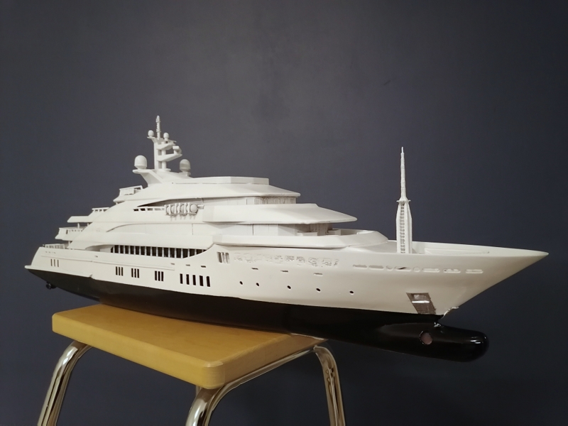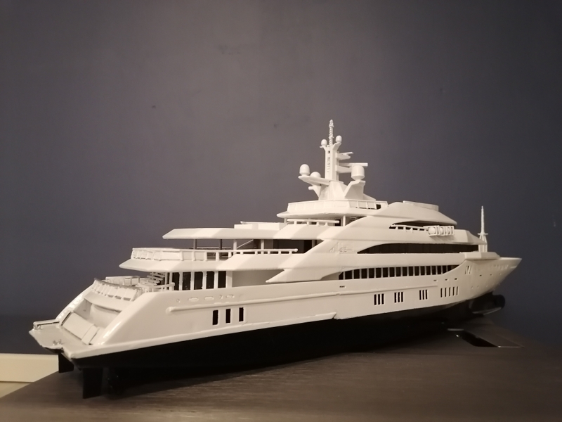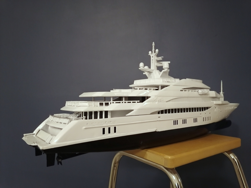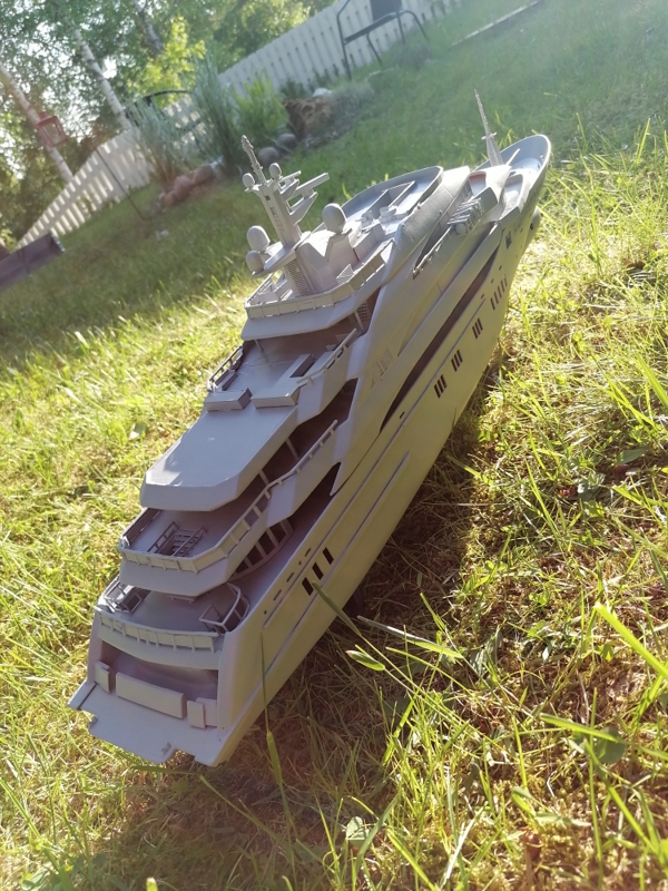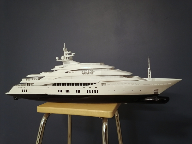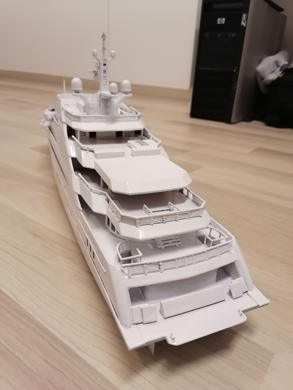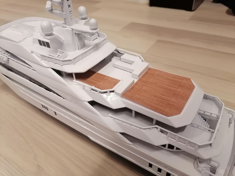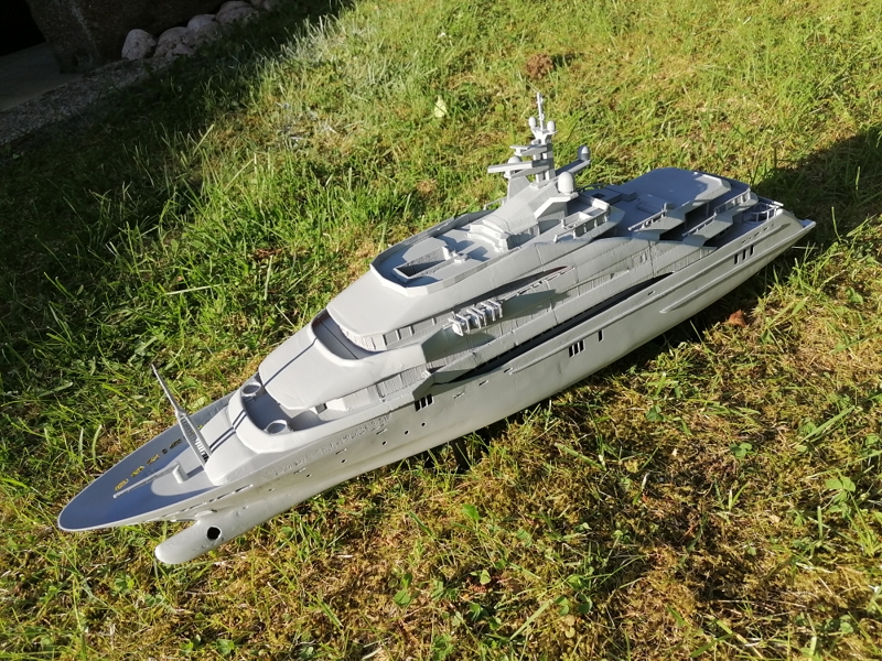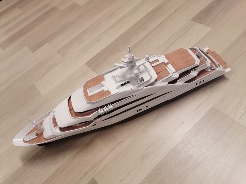 Final, Mega Yacht. One line Windows painted others have glued black glossy plastic. Still my painting skills are horrible. Hands shaking and eyes in bad condition. Learned so much with this project. If I do it once again this time to 1:100 scale it will be 80cm long, then I sure will make many thinks different. Considering doing it one more, not joking. I call her ready But just trying out printed paper decks. What do you folks think? Will it stick if I glue it over paint and lack spray it Or will I ruin the ship? One option is sure to keep her floors white. Opinions or any experience?
