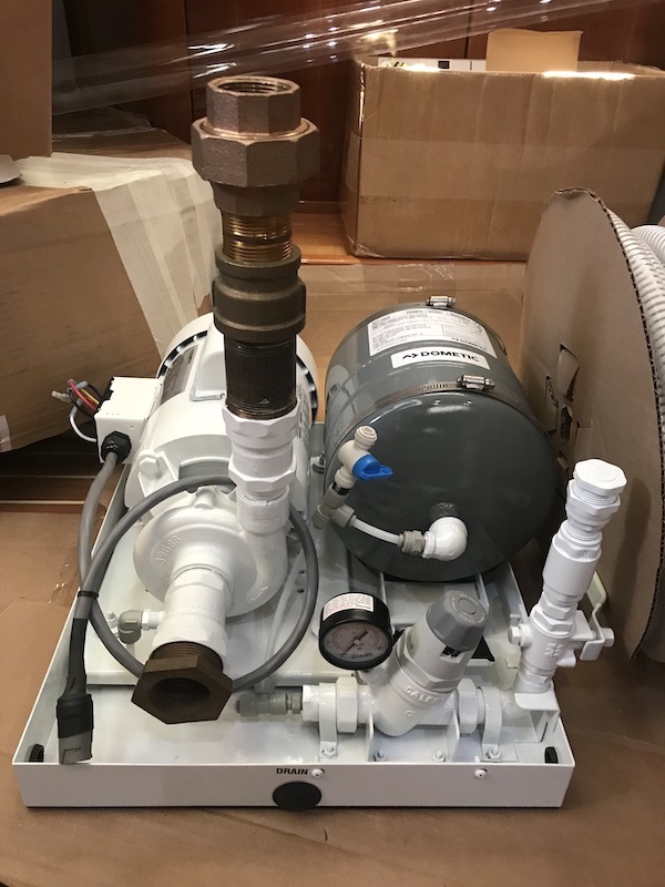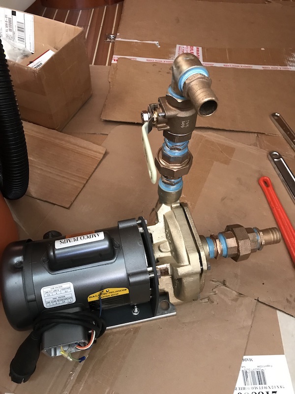 Salt water pump set up, with the 12" rise as required by Dometic. The original installation had the discharge coming out horizontally right into the SW supply line.