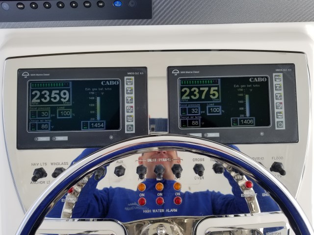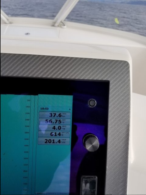 After a little yard time to have thruster tube glassed in and old bottom paint sanded down and 2 coat of Cukote it was time to open it up on the run home for 1 to 2 minutes. See attached pics. RPM's of 2359 Port and 2375 Stbd. Coolant temps were 192/190 respectively and 80gph at 100% load. 37.6knots. 20171006_105509 (Small).jpg 20171006_105512 (Small).jpg