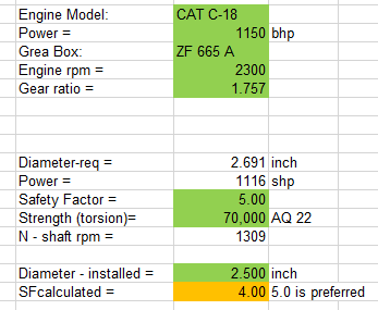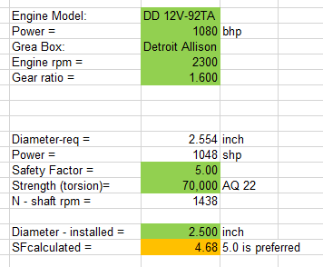 It does not accurately scale on a percentage basis. I recalculated with a 2.750" diameter shaft and you get a SF of 4.744, which is better than the 4.68 you had on your 2.500" shafts with the Detroit's. Your shaft diameter is only 0.046" away from the design target, this is where the engineer has to put on his thinking cap and make a practical assessment and live with the 4.744 SF. A 3.000" shaft is overkill at a SF of 6.159, I would have to say go with the 2.750" in your case.