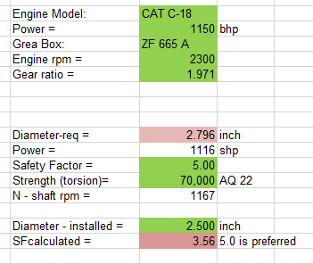 PB - Is my math correct that using the 2.75" shafts with 1.97:1 will give me an actual safety factor of 4.9177 ? I just did a simple % take off from what you provided showing a 2.796" shaft needed to get to a 5.0 safety factor.