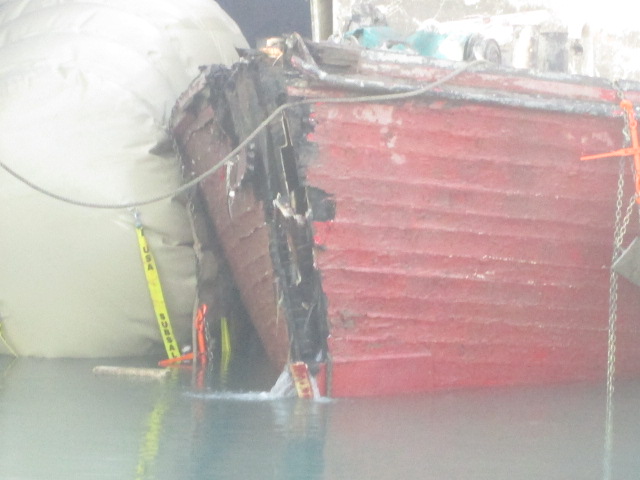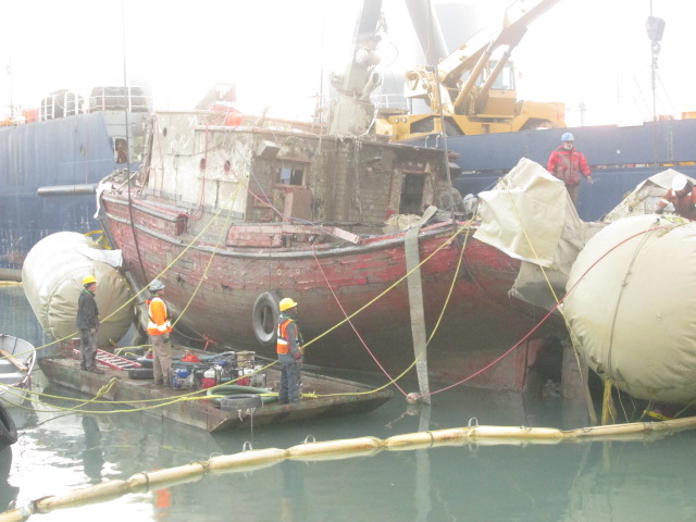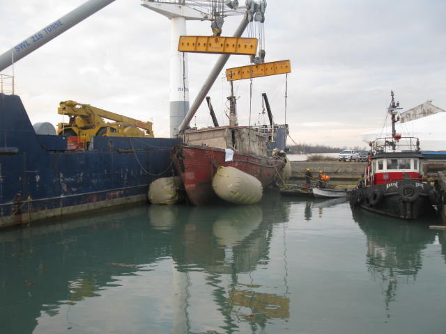 Divers have worked the last five days preparing to remove it from canal. They put air bags around it and brought in a heavy lift barge. When they rasied the boat they attached a snatch block and cable to the barge and tried to pull it out of ship yard to barge with a tug. They had it part way out of ship yard and boat went aground. They are hoping to lift wreck and lower onto a barge then take it to Hamilton to scrap. They have now given up for the night and will try and lift boat tomorrow. Weather today -5 C and snow and water is 40 F Capture.PNG Divers 001.JPG Divers 005.JPG Divers 006.JPG Divers 009.JPG
